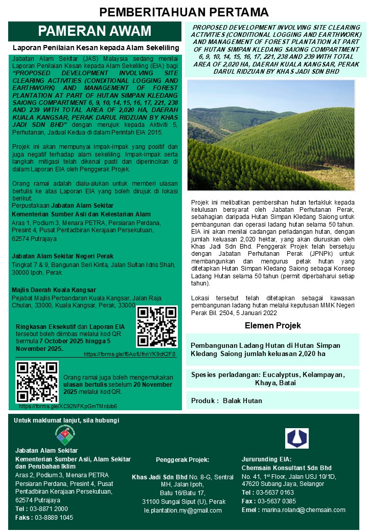 Laporan EIA ini akan dipamerkan dalam tempoh 7 Oktober 2025 hingga 5 November 2025 dan ulasan awam sehingga 20 November 2025.