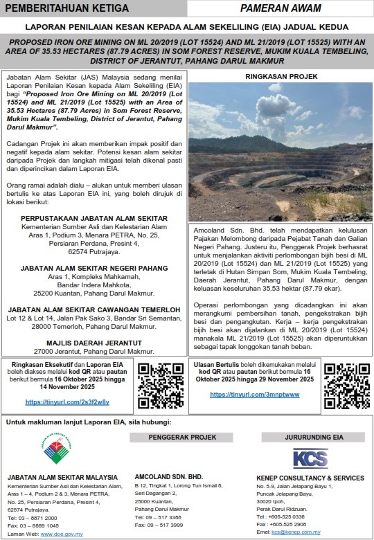 Laporan EIA ini akan dipamerkan dalam tempoh 16 Oktober 2025 hingga 14 November 2025 dan ulasan awam sehingga 29 November 2025.