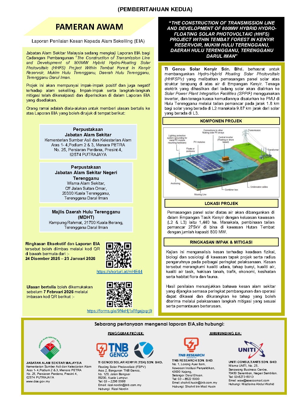 Laporan EIA ini akan dipamerkan dalam tempoh 24 Disember 2025 hingga 23 Januari 2026 dan ulasan awam sehingga 7 February 2026. Laporan EIA ini turut dipamerkan di pusat pameran awam terpilih atau boleh dirujuk seperti butiran dibawah: