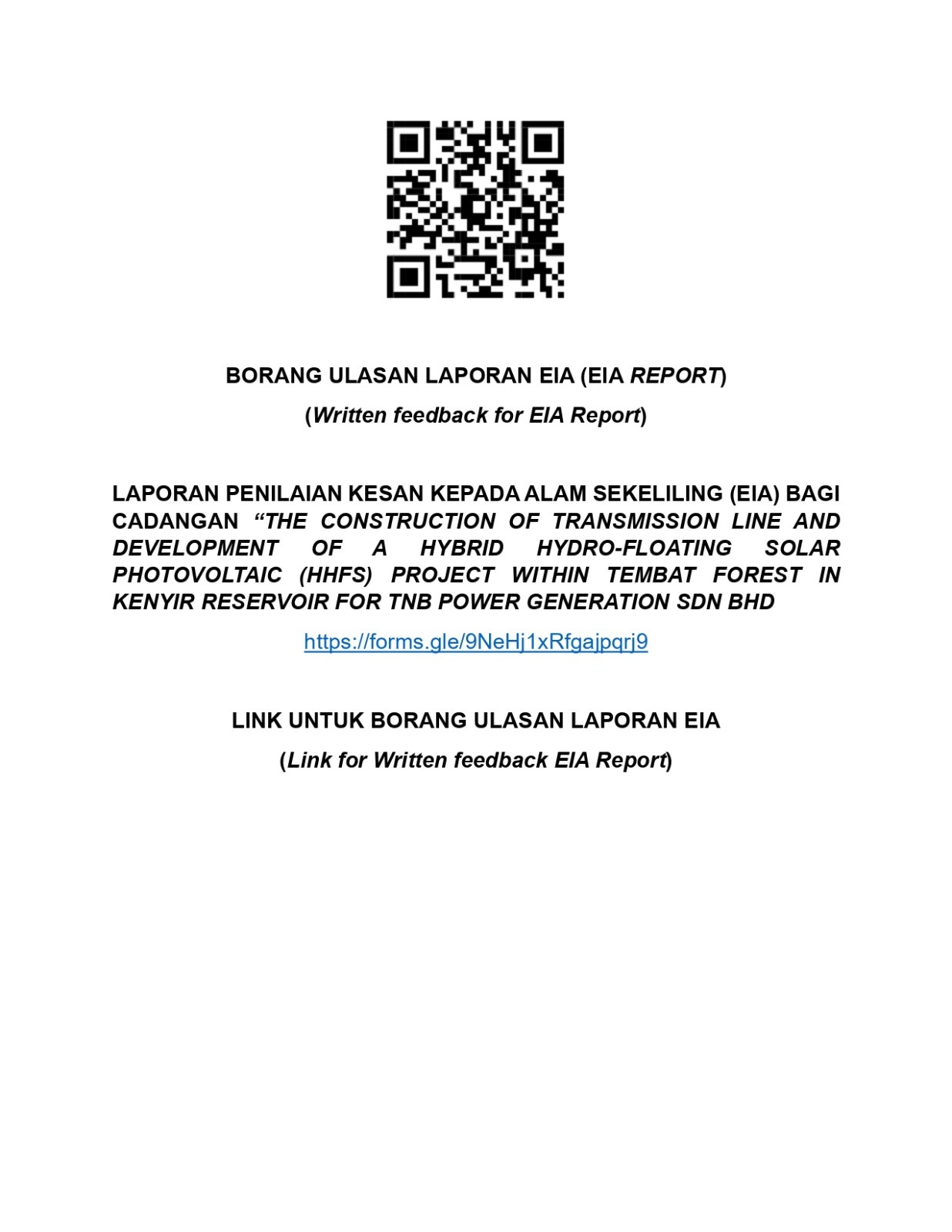 Orang awam adalah dijemput untuk memberi ulasan dengan mengemukakan maklum balas berdasarkan penelitian berkaitan Laporan EIA tersebut dalam tempoh pameran yang telah ditetapkan.