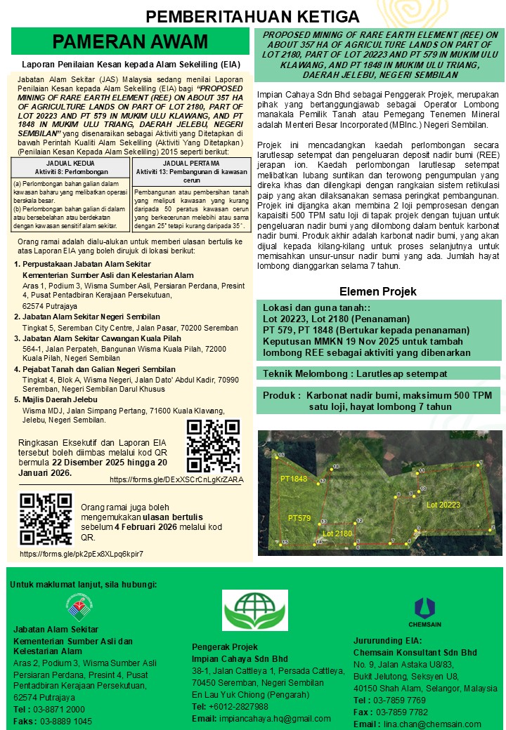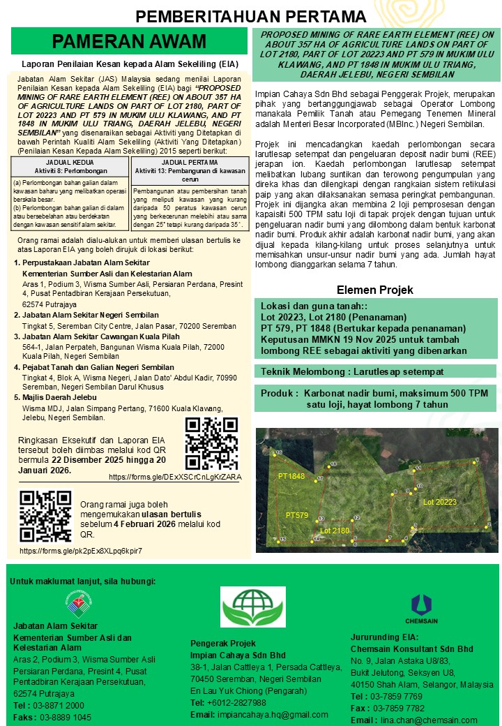 Laporan EIA ini akan dipamerkan dalam tempoh 22 Disember 2025 hingga 20 Januari 2026 dan ulasan awam sehingga 4 Februari 2026. Laporan EIA ini turut dipamerkan di pusat pameran awam terpilih atau boleh dirujuk seperti butiran dibawah: