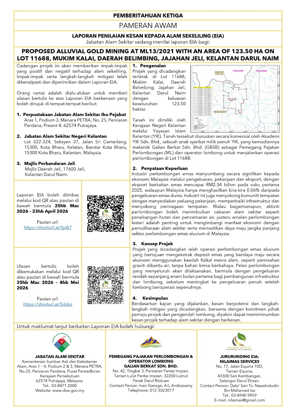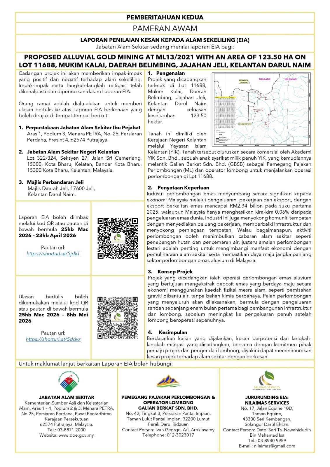Laporan EIA ini akan dipamerkan dalam tempoh 25 Mac 2026 hingga 23 April 2026 dan ulasan awam sehingga 8 Mei 2026. Laporan EIA ini turut dipamerkan di pusat pameran awam terpilih atau boleh dirujuk seperti butiran dibawah: