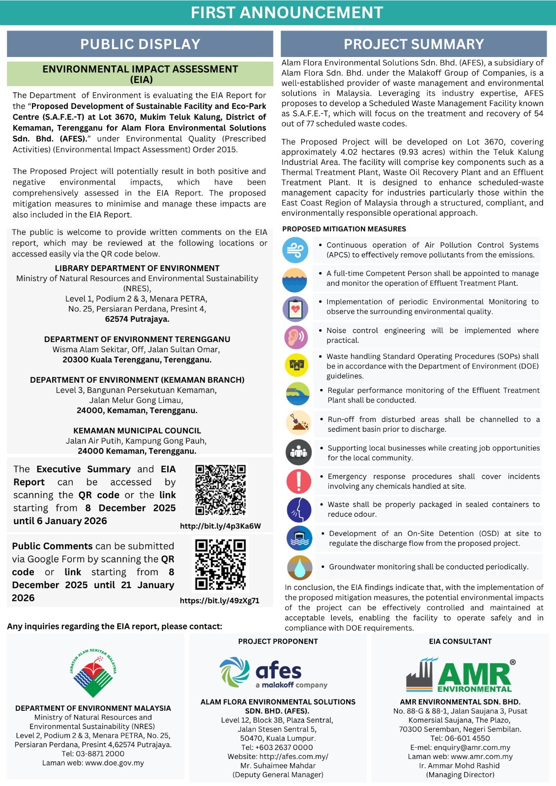 This EIA report will be displayed from 8 Disember 2025 to 6 Januari 2025 with public comments accepted until 21 Januari 2026. This EIA Report is also available for viewing at selected locations or can be referred as below: