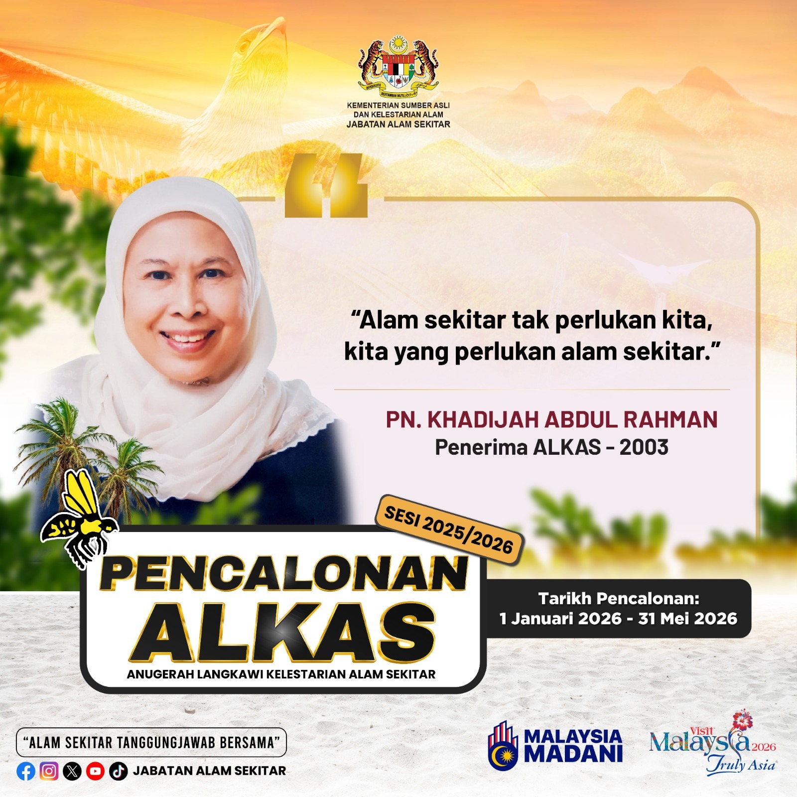 Nominations for Langkawi Award – Environmental Sustainability (ALKAS) for the 2025/2026 session is now open from January 1, 2026 until May 31, 2026. All individuals and organizations interested in participating in ALKAS are invited to access the nomination forms, criteria, and terms through the following link: